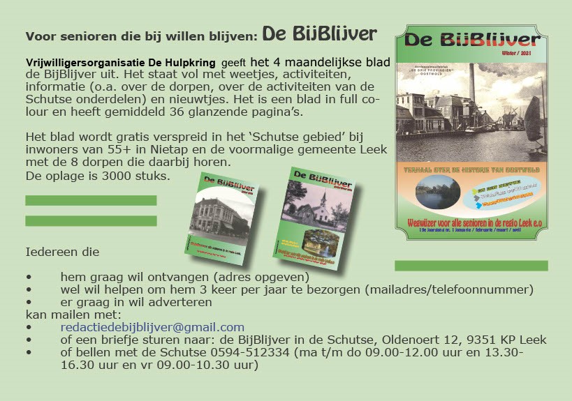 Wij bieden aan alle bewoners van de voormalige gemeente Leek en het dorp Nietap diverse soorten hulp. In Leek zijn verschillende organisaties actief op het gebied van de vrijwillige hulp. Dit zijn naast De Hulpkring onder meer: de Zonnebloem, Humanitas, het Rode Kruis en de Kerken. Wij informeren u graag over hun mogelijkheden.